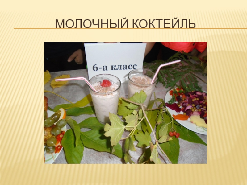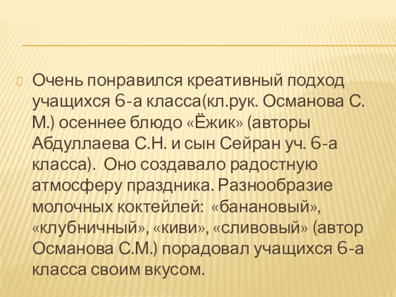 «Ёжик» (авторы Абдуллаева С.Н. и сын Сейран уч. 6-а класса). Оно создавало радостную атмосферу праздника. Разнообразие молочных коктейлей: «банановый», «клубничный», «киви», «сливовый» (автор Османова С.М.) порадовал учащихся 6-а класса своим вкусом.