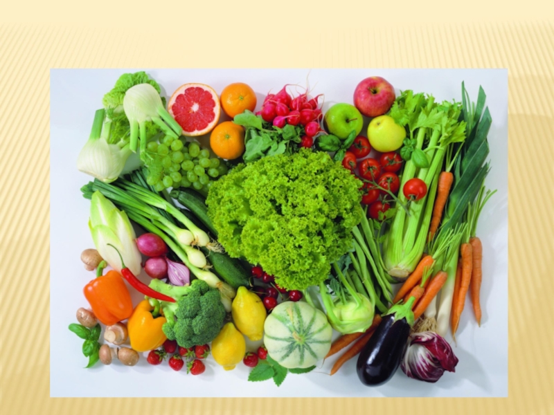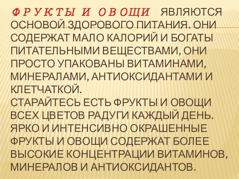 Слайд 90Фрукты и овощи являются основой здорового питания. Они содержат мало калорий