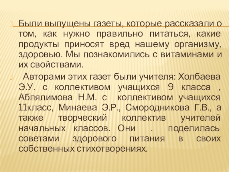 Авторами этих газет были учителя: Холбаева Э.У. с коллективом учащихся 9 класса , Аблялимова Н.М. с коллективом учащихся 11класс, Минаева Э.Р., Смородникова Г.В., а также творческий коллектив учителей начальных классов. Они . поделилась советами здорового питания в своих собственных стихотворениях.