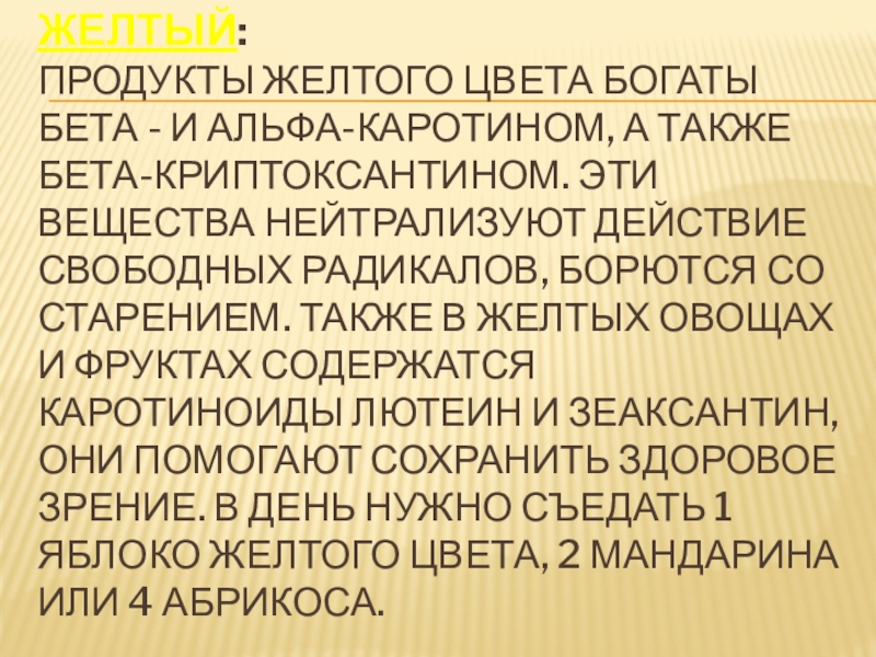 бета-криптоксантином. Эти вещества нейтрализуют действие свободных радикалов, борются со старением. Также в желтых овощах и фруктах содержатся каротиноиды лютеин и зеаксантин, они помогают сохранить здоровое зрение. В день нужно съедать 1 яблоко желтого цвета, 2 мандарина или 4 абрикоса.