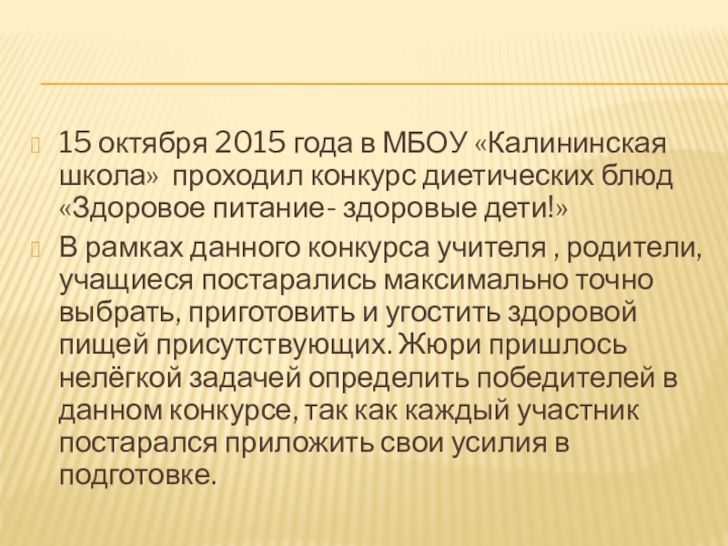 Слайд 315 октября 2015 года в МБОУ «Калининская школа» проходил конкурс диетических