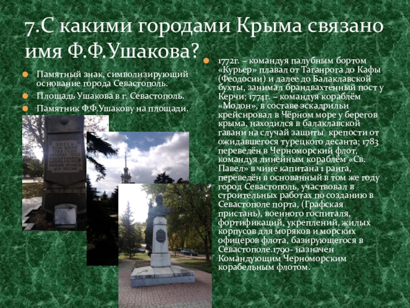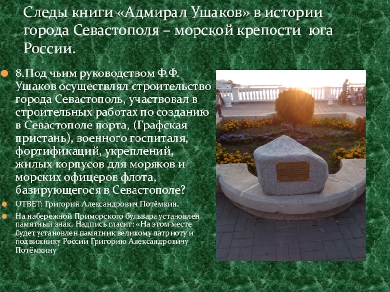 8.Под чьим руководством Ф.Ф.Ушаков осуществлял строительство города Севастополь, участвовал в строительных работах по созданию в Севастополе порта, (Графская пристань), военного госпиталя, фортификаций, укреплений, жилых корпусов для моряков и морских офицеров флота, базирующегося в Севастополе?