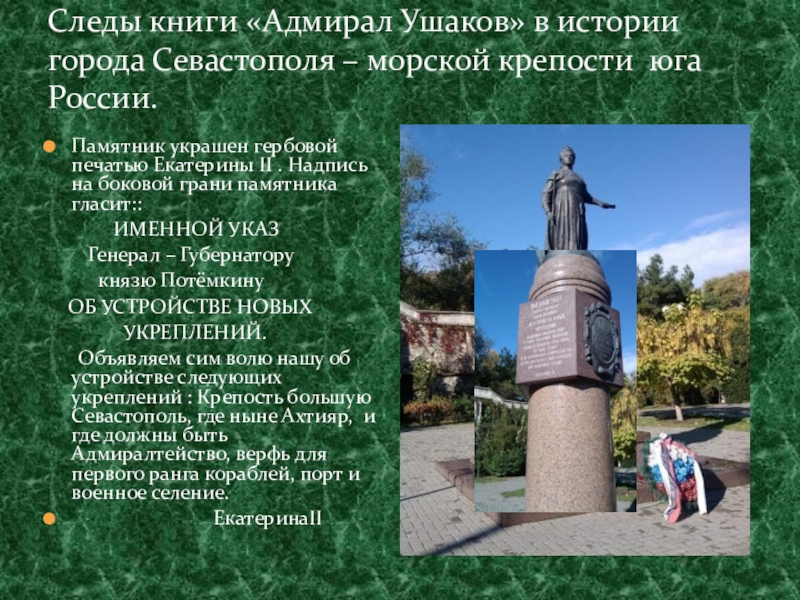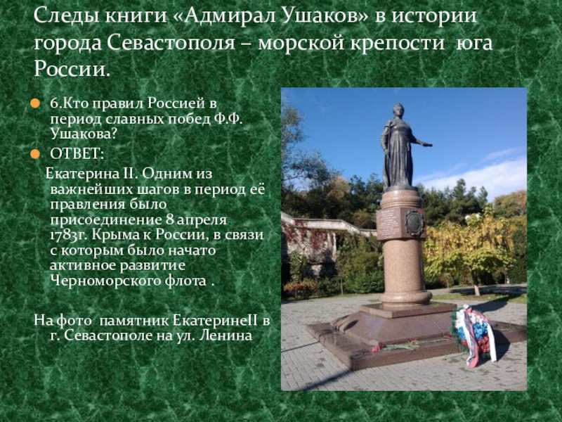 На фото памятник ЕкатеринеII в г. Севастополе на ул. Ленина