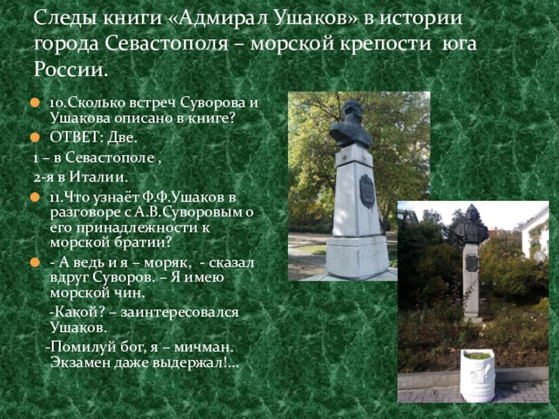 10.Сколько встреч Суворова и Ушакова описано в книге?