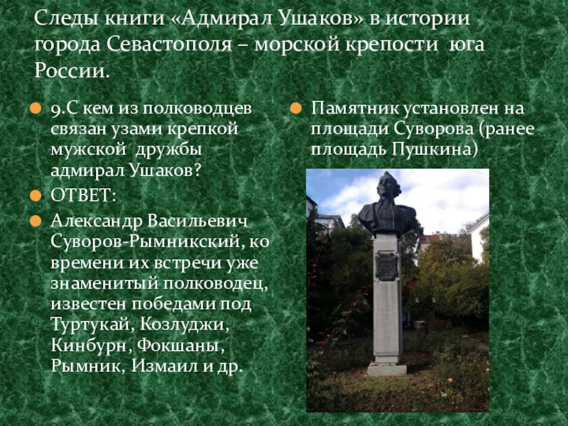 9.С кем из полководцев связан узами крепкой мужской дружбы адмирал Ушаков?
