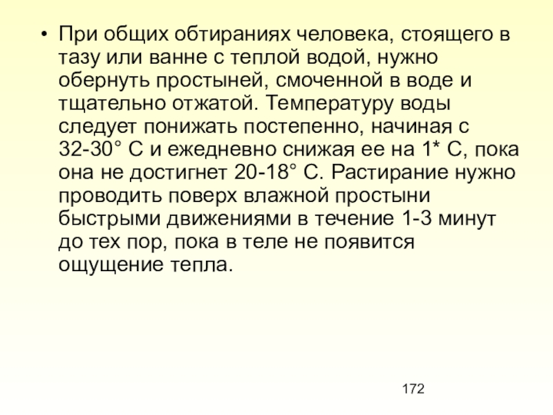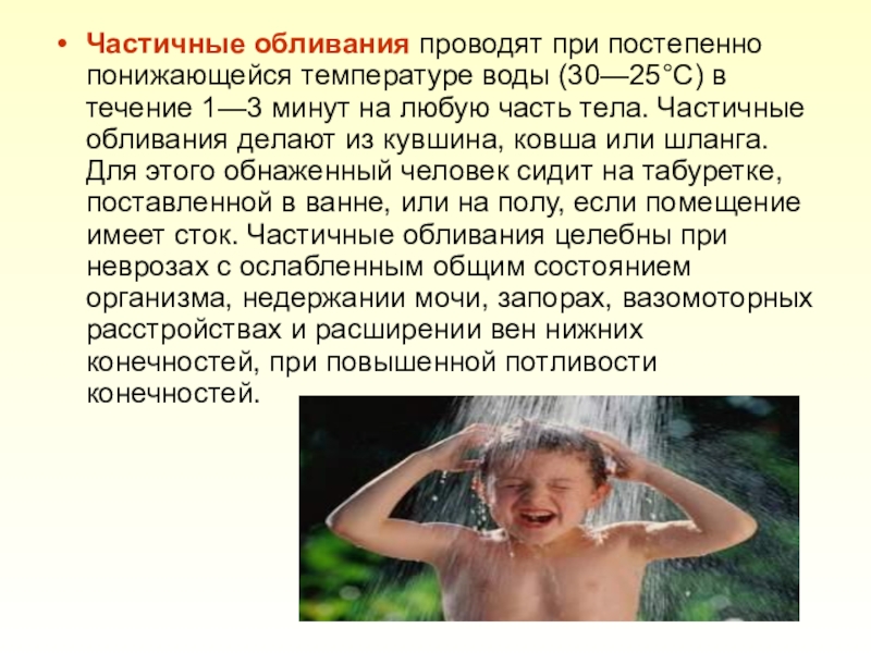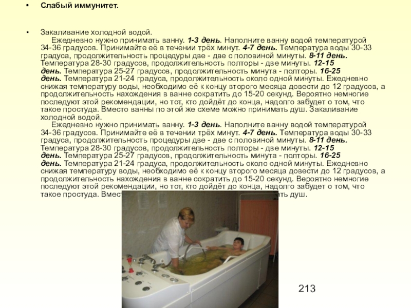 водой температурой 34-36 градусов. Принимайте её в течении трёх минут. 4-7 день. Температура воды 30-33 градуса, продолжительность процедуры две - две с половиной минуты. 8-11 день.Температура 28-30 градусов, продолжительность полторы - две минуты. 12-15 день. Температура 25-27 градусов, продолжительность минута - полторы. 16-25 день. Температура 21-24 градуса, продолжительность около одной минуты. Ежедневно снижая температуру воды, необходимо её к концу второго месяца довести до 12 градусов, а продолжительность нахождения в ванне сократить до 15-20 секунд. Вероятно немногие последуют этой рекомендации, но тот, кто дойдёт до конца, надолго забудет о том, что такое простуда. Вместо ванны по этой же схеме можно принимать душ. Закаливание холодной водой.