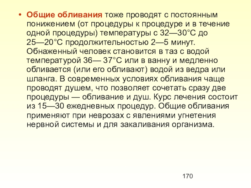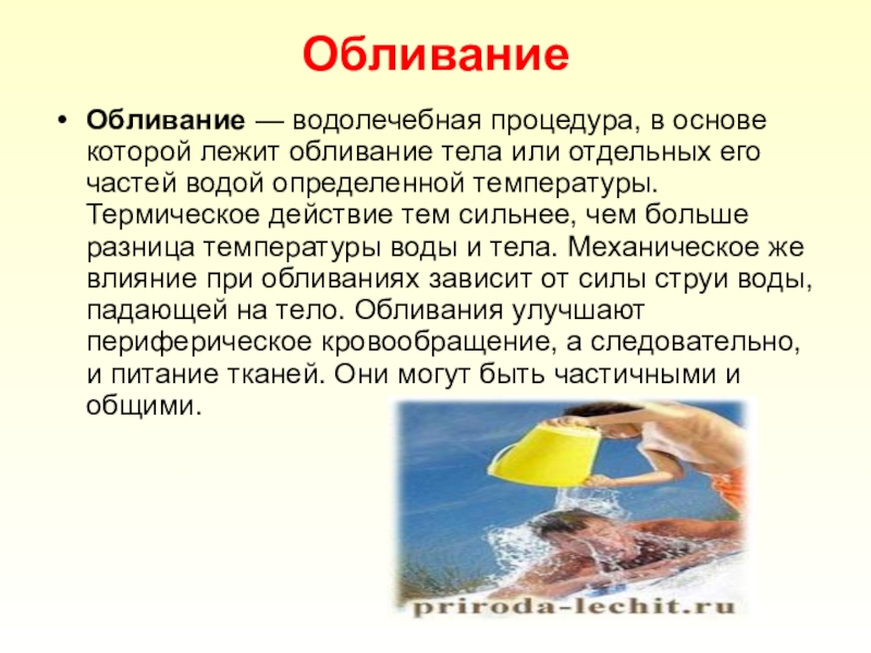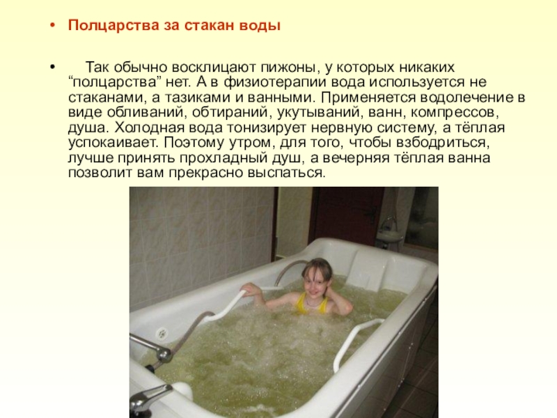 нет. А в физиотерапии вода используется не стаканами, а тазиками и ванными. Применяется водолечение в виде обливаний, обтираний, укутываний, ванн, компрессов, душа. Холодная вода тонизирует нервную систему, а тёплая успокаивает. Поэтому утром, для того, чтобы взбодриться, лучше принять прохладный душ, а вечерняя тёплая ванна позволит вам прекрасно выспаться.