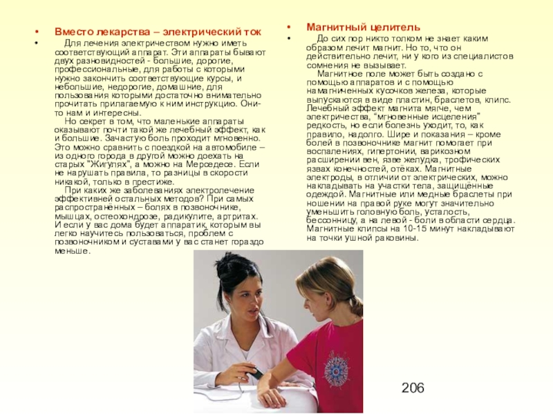 Магнитное поле может быть создано с помощью аппаратов и с помощью намагниченных кусочков железа, которые выпускаются в виде пластин, браслетов, клипс. Лечебный эффект магнита мягче, чем электричества, “мгновенные исцеления” редкость, но если болезнь уходит, то, как правило, надолго. Шире и показания – кроме болей в позвоночнике магнит помогает при воспалениях, гипертонии, варикозном расширении вен, язве желудка, трофических язвах конечностей, отёках. Магнитные электроды, в отличии от электрических, можно накладывать на участки тела, защищённые одеждой. Магнитные или медные браслеты при ношении на правой руке могут значительно уменьшить головную боль, усталость, бессонницу, а на левой - боли в области сердца. Магнитные клипсы на 10-15 минут накладывают на точки ушной раковины.