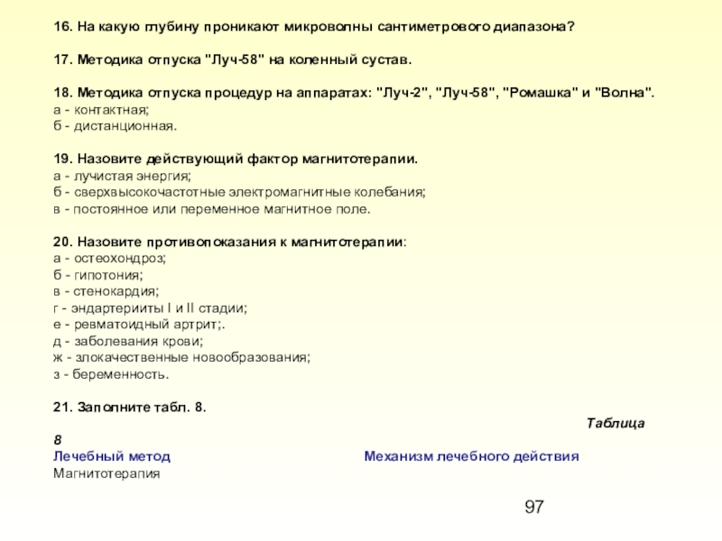 Слайд 10Самыми популярными и востребованными физиотерапевтическими способами являются тепловое лечение, электролечение, водолечение,