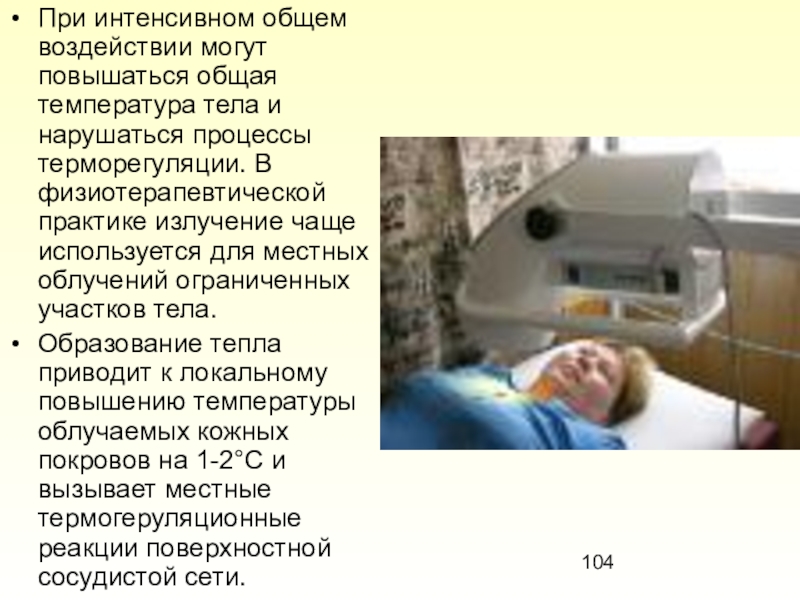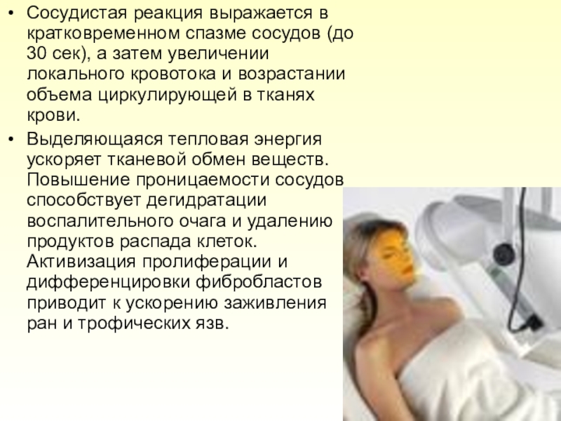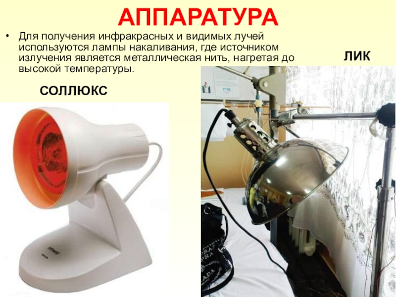 Действие инфракрасной лампы, в отличии от ультрафиолетовой, приводит к повышению температуры в месте воздействия, ускорению обмена веществ и за счёт этого к улучшению кровообращения, усилению размножения клеток (при раке не применять!), регенерации тканей при хронических воспалениях, быстрому заживлению травм и исчезновению свежих послеоперационных рубцов.
