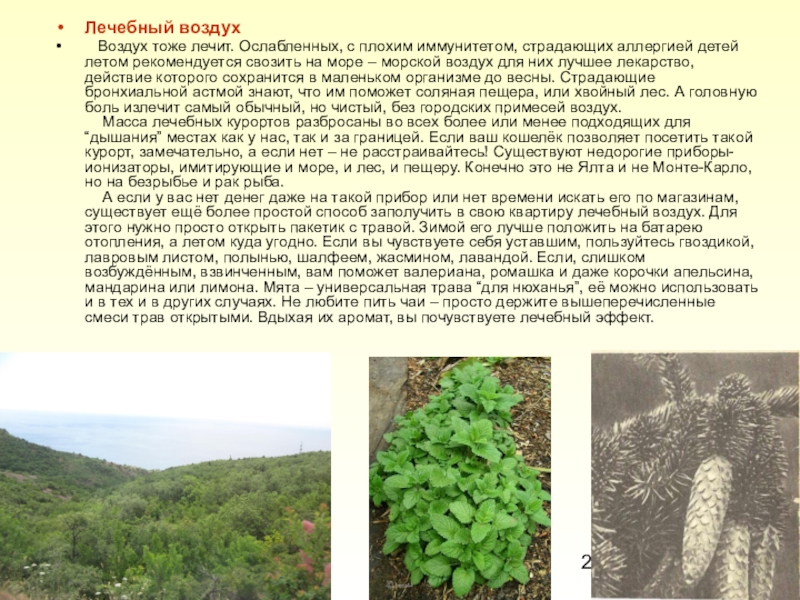 летом рекомендуется свозить на море – морской воздух для них лучшее лекарство, действие которого сохранится в маленьком организме до весны. Страдающие бронхиальной астмой знают, что им поможет соляная пещера, или хвойный лес. А головную боль излечит самый обычный, но чистый, без городских примесей воздух.