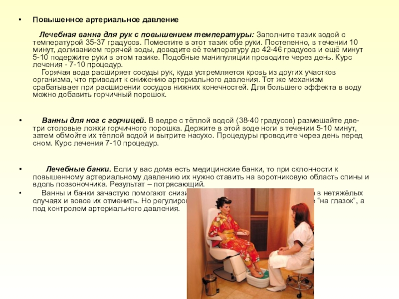 Горячая вода расширяет сосуды рук, куда устремляется кровь из других участков организма, что приводит к снижению артериального давления. Тот же механизм срабатывает при расширении сосудов нижних конечностей. Для большего эффекта в воду можно добавить горчичный порошок.
