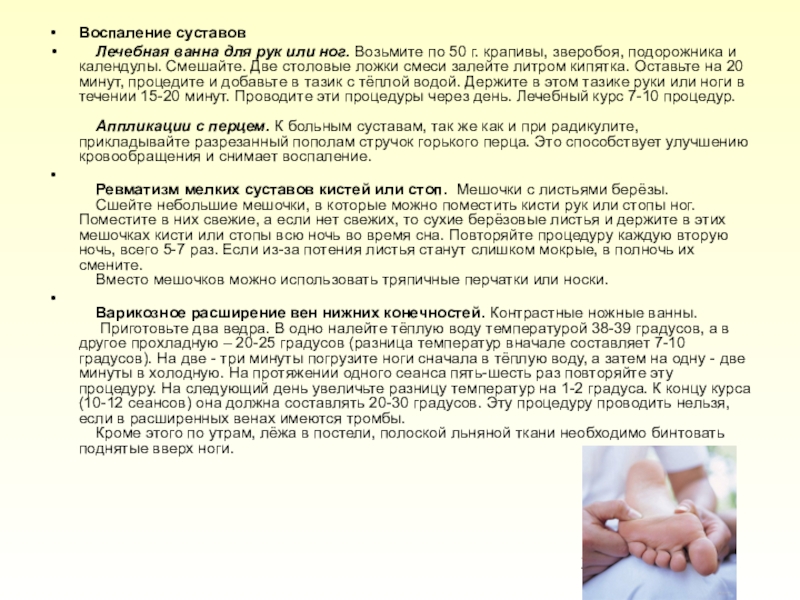 крапивы, зверобоя, подорожника и календулы. Смешайте. Две столовые ложки смеси залейте литром кипятка. Оставьте на 20 минут, процедите и добавьте в тазик с тёплой водой. Держите в этом тазике руки или ноги в течении 15-20 минут. Проводите эти процедуры через день. Лечебный курс 7-10 процедур.