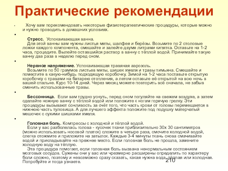 Бессонница. Если вам трудно уснуть, перед сном погуляйте на свежем воздухе, а затем сделайте ножную ванну с тёплой водой или положите к ногам горячую грелку. Эти процедуры вызывают сонливость за счёт того, что часть крови от головы перемещается в нижнюю часть туловища. А для лучшего эффекта положите под подушку матерчатый мешочек с сухими шишками хмеля.