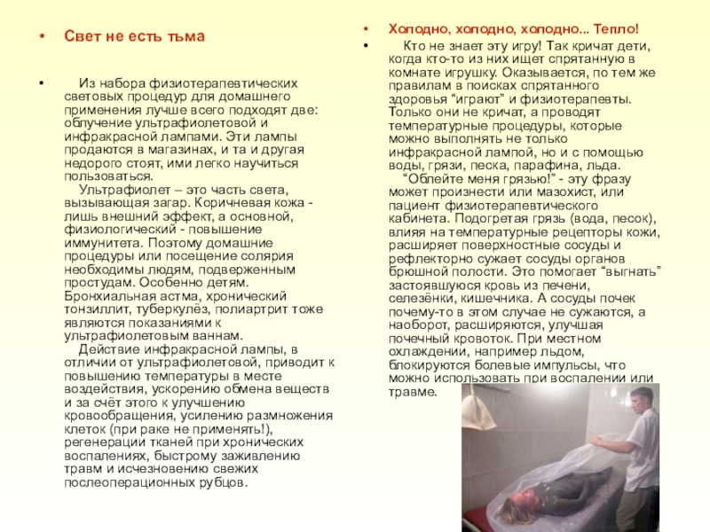 Кто не знает эту игру! Так кричат дети, когда кто-то из них ищет спрятанную в комнате игрушку. Оказывается, по тем же правилам в поисках спрятанного здоровья “играют” и физиотерапевты. Только они не кричат, а проводят температурные процедуры, которые можно выполнять не только инфракрасной лампой, но и с помощью воды, грязи, песка, парафина, льда.