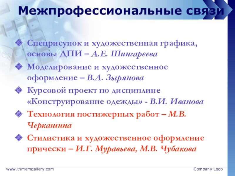 www.thmemgallery.comCompany LogoМежпрофессиональные связиСпецрисунок и художественная графика, основы ДПИ – А.Е. ШингарееваМоделирование и художественное оформление – В.А. ЗыряноваКурсовой
