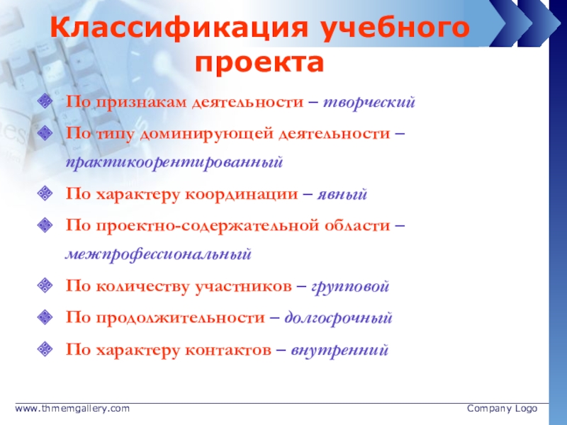 www.thmemgallery.comCompany Logo  Классификация учебного проекта  По признакам деятельности – творческийПо типу доминирующей деятельности – практикоорентированныйПо