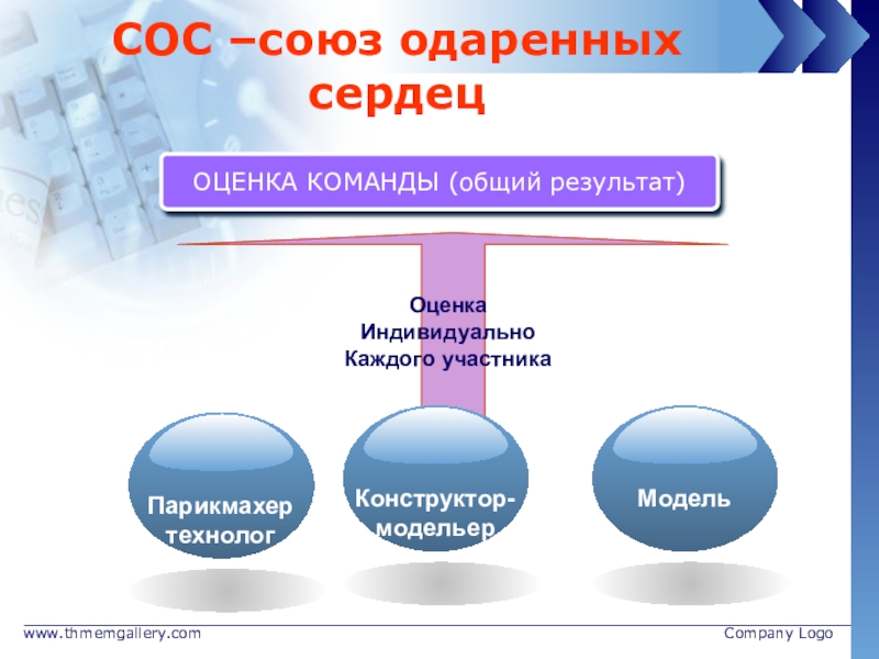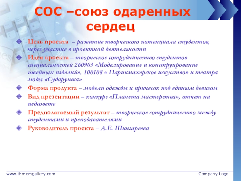 www.thmemgallery.comCompany Logo СОС –союз одаренных сердец Цель проекта – развитие творческого потенциала студентов, через участие в проектной деятельностиИдея проекта – творческое сотрудничество студентов специальностей 260903 «Моделирование и конструирование швейных изделий», 100108 « Парикмахерское