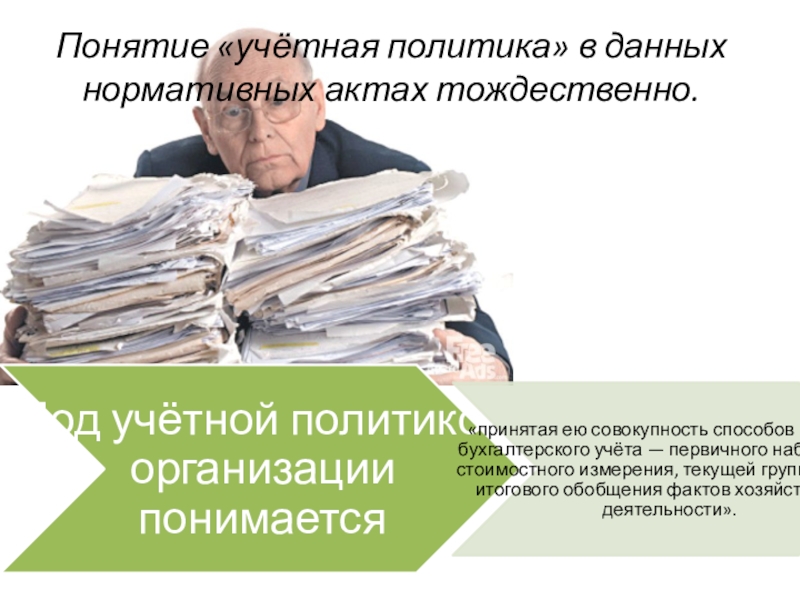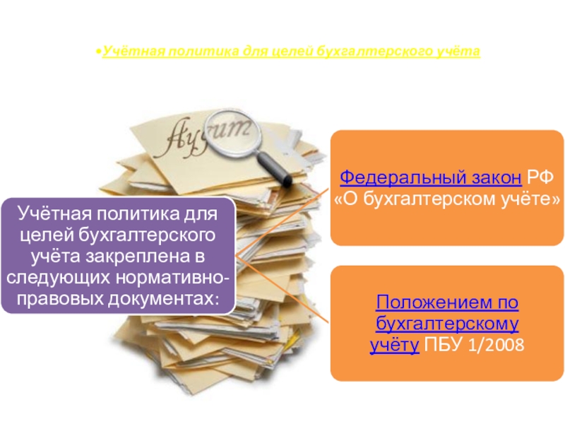 Основы формирования (выбора и обоснования) и раскрытия (придания гласности) учётной политики предприятия впервые были раскрыты в ПБУ 1/94 «Учётная политика предприятия», утверждённом Приказом Минфина России от 28.07.1994 № 100.