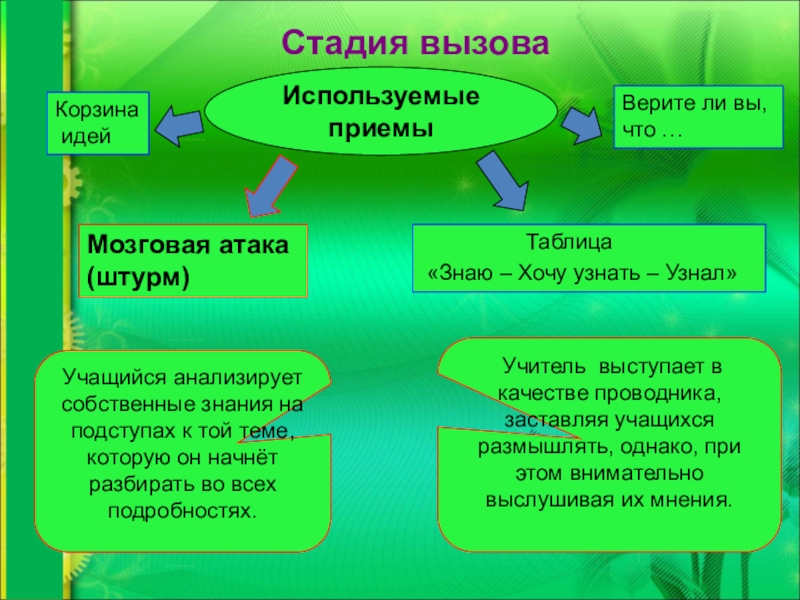 Учитель выступает в качестве проводника, заставляя учащихся размышлять, однако, при этом внимательно выслушивая их мнения.