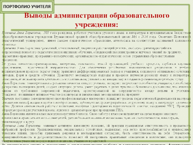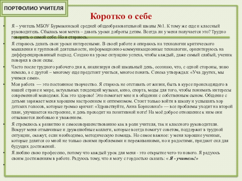 Моя работа — это постоянное творчество. Я старюсь не отставать от жизни, быть в курсе происходящего в нашей стране и мире, актуальных тенденций музыки, кино, спорта, моды для того, чтобы понимать интересы современной молодежи. Как это здорово! Это помогает мне и в общении с собственным сыном. Общение с детьми заряжает меня хорошим настроением и оптимизмом. Стоит только войти в школу и услышать хор детских голосов, которые громко кричат: «Здравствуйте, Анна Борисовна!» — все проблемы уходят на второй план, улучшается настроение, и день проходит на позитивной ноте! На моё доброе отношение к ним они отзываются любовью и уважением.