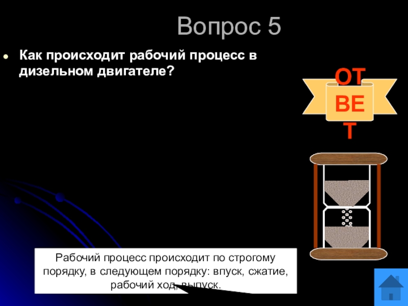 Рабочий процесс происходит по строгому порядку, в следующем порядку: впуск, сжатие, рабочий ход, выпуск.