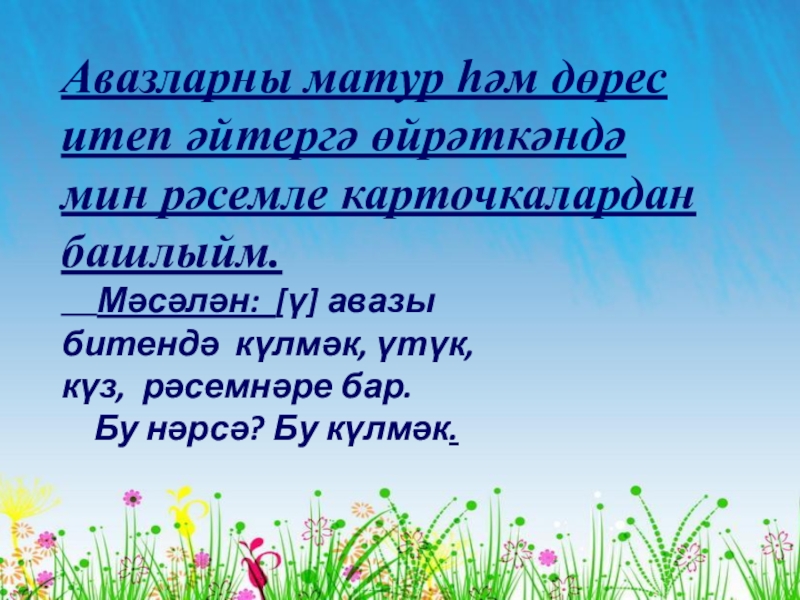 Слайд 7Авазларны матур һәм дөрес итеп әйтергә өйрәткәндә мин рәсемле карточкалардан башлыйм.