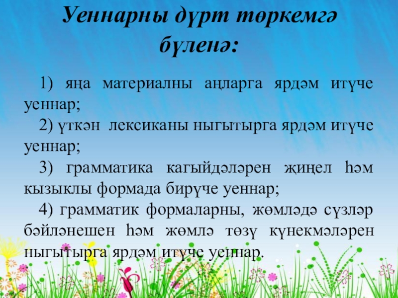 3) грамматика кагыйдәләрен җиңел һәм кызыклы формада бирүче уеннар;