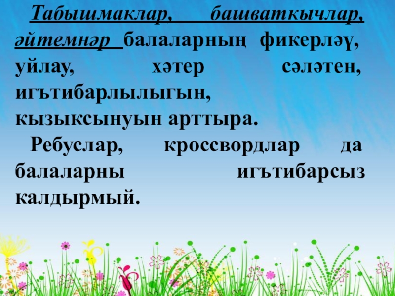 Табышмаклар, башваткычлар, әйтемнәр балаларның фикерләү, уйлау, хәтер сәләтен, игътибарлылыгын, кызыксынуын арттыра. Ребуслар, кроссвордлар да балаларны