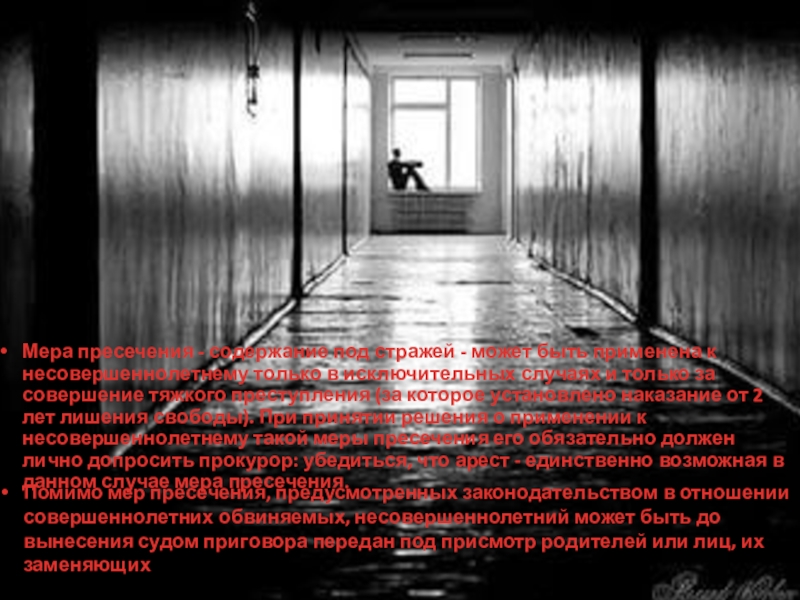 Помимо мер пресечения, предусмотренных законодательством в отношении совершеннолетних обвиняемых, несовершеннолетний может быть до вынесения судом приговора передан под присмотр родителей или лиц, их заменяющих
