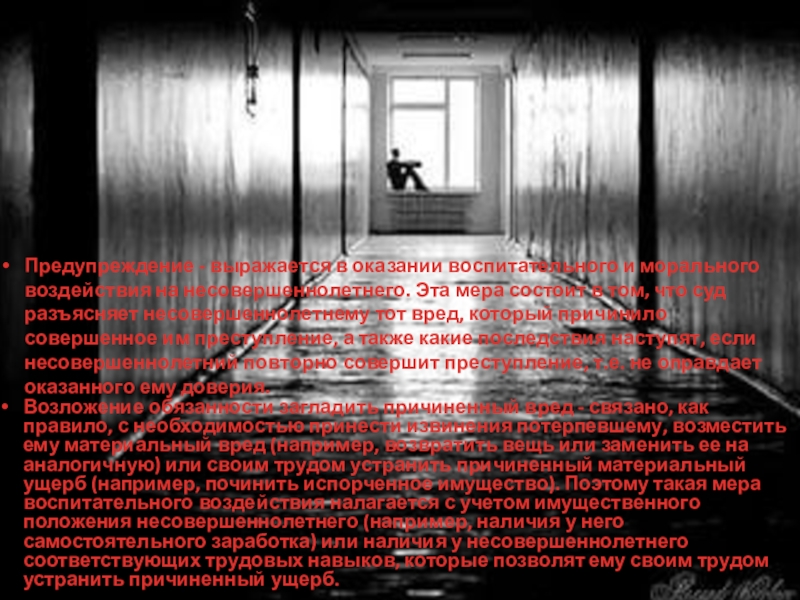 Возложение обязанности загладить причиненный вред - связано, как правило, с необходимостью принести извинения потерпевшему, возместить ему материальный вред (например, возвратить вещь или заменить ее на аналогичную) или своим трудом устранить причиненный материальный ущерб (например, починить испорченное имущество). Поэтому такая мера воспитательного воздействия налагается с учетом имущественного положения несовершеннолетнего (например, наличия у него самостоятельного заработка) или наличия у несовершеннолетнего соответствующих трудовых навыков, которые позволят ему своим трудом устранить причиненный ущерб.