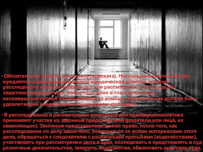 В расследовании и рассмотрении уголовных дел несовершеннолетних принимают участие их законные представители (родители или лица, их заменяющие). Законные представители имеют право, после того, как расследование по делу закончено, знакомиться со всеми материалами этого дела, обращаться к следователю с различными просьбами (ходатайствами), участвовать при рассмотрении дела в суде, исследовать и представлять в суд различные доказательства, заявлять ходатайства, обжаловать приговор суда.