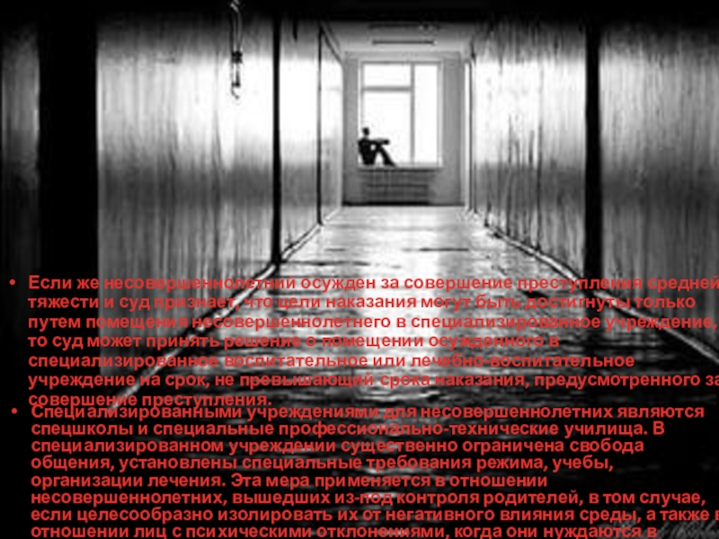 Специализированными учреждениями для несовершеннолетних являются спецшколы и специальные профессионально-технические училища. В специализированном учреждении существенно ограничена свобода общения, установлены специальные требования режима, учебы, организации лечения. Эта мера применяется в отношении несовершеннолетних, вышедших из-под контроля родителей, в том случае, если целесообразно изолировать их от негативного влияния среды, а также в отношении лиц с психическими отклонениями, когда они нуждаются в специальном лечении.