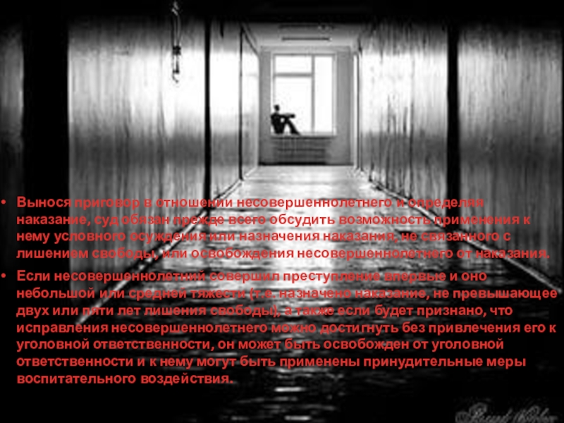Если несовершеннолетний совершил преступление впервые и оно небольшой или средней тяжести (т.е. назначено наказание, не превышающее двух или пяти лет лишения свободы), а также если будет признано, что исправления несовершеннолетнего можно достигнуть без привлечения его к уголовной ответственности, он может быть освобожден от уголовной ответственности и к нему могут быть применены принудительные меры воспитательного воздействия.