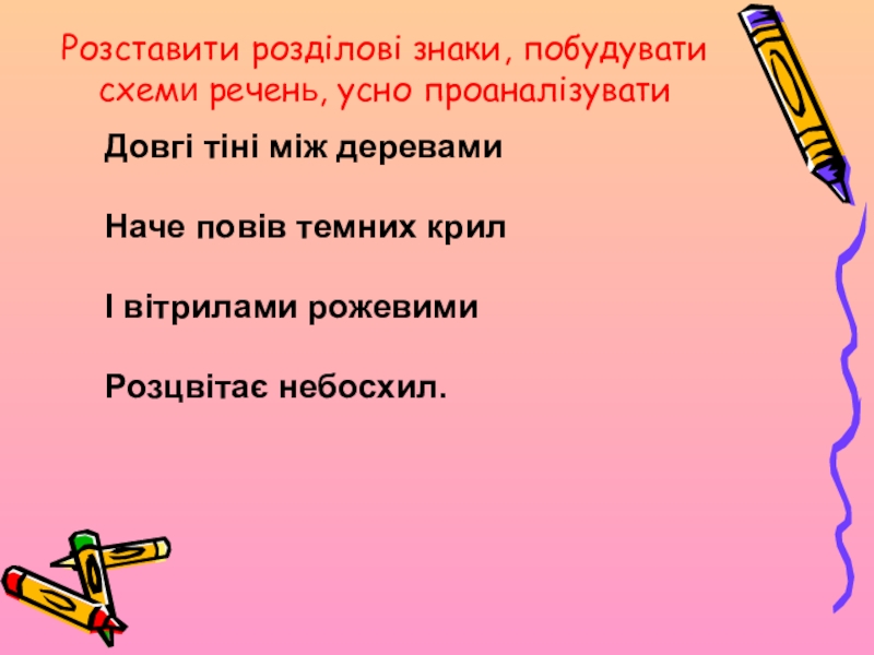 Слайд 10Розставити розділові знаки, побудувати схеми речень, усно проаналізувати