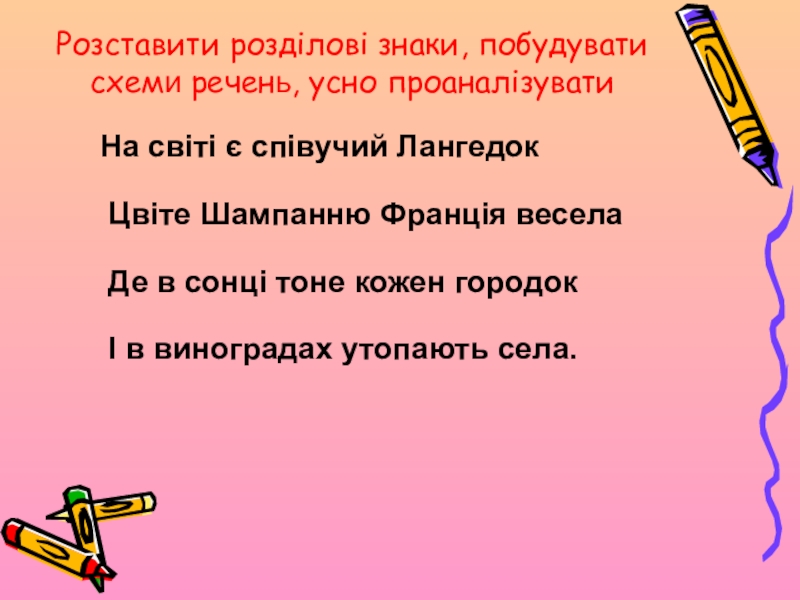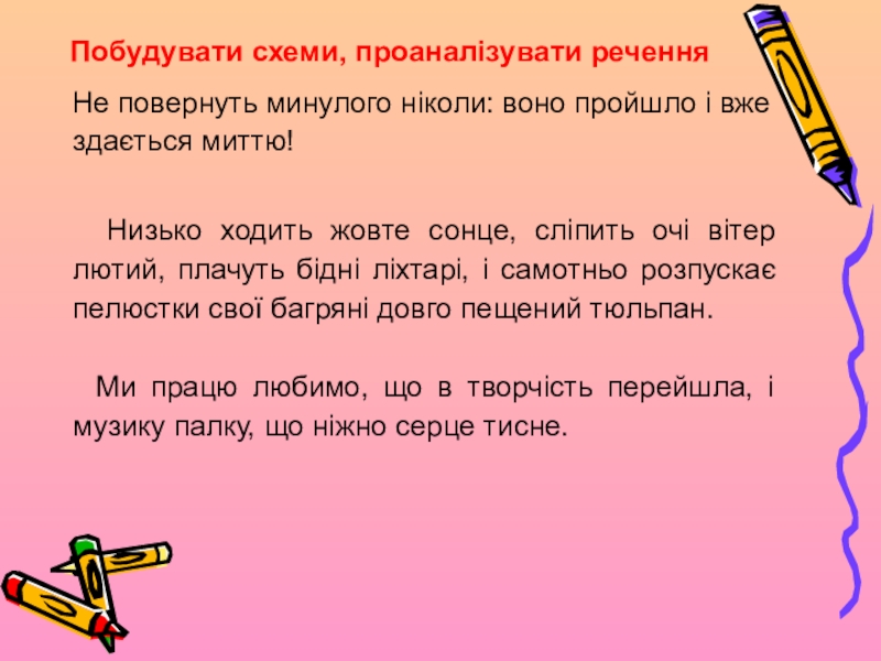 Слайд 11Розставити розділові знаки, побудувати схеми речень, усно проаналізувати