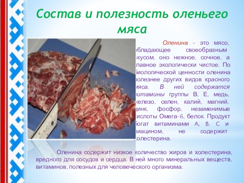 обладающее своеобразным вкусом, оно нежное, сочное, а главное экологически чистое. По биологической ценности оленина полезнее других видов красного мяса. В ней содержатся витамины группы В, Е, медь, железо, селен, калий, магний, цинк, фосфор, незаменимые кислоты Омега-6, белок. Продукт богат витаминами A, B, C и ниацином, не содержит холестерина.