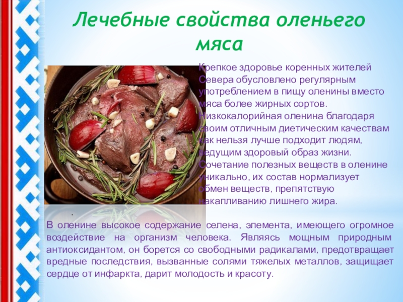 Слайд 4Но особенно ценным качеством оленины, которое выгодно отличает ее от традиционных