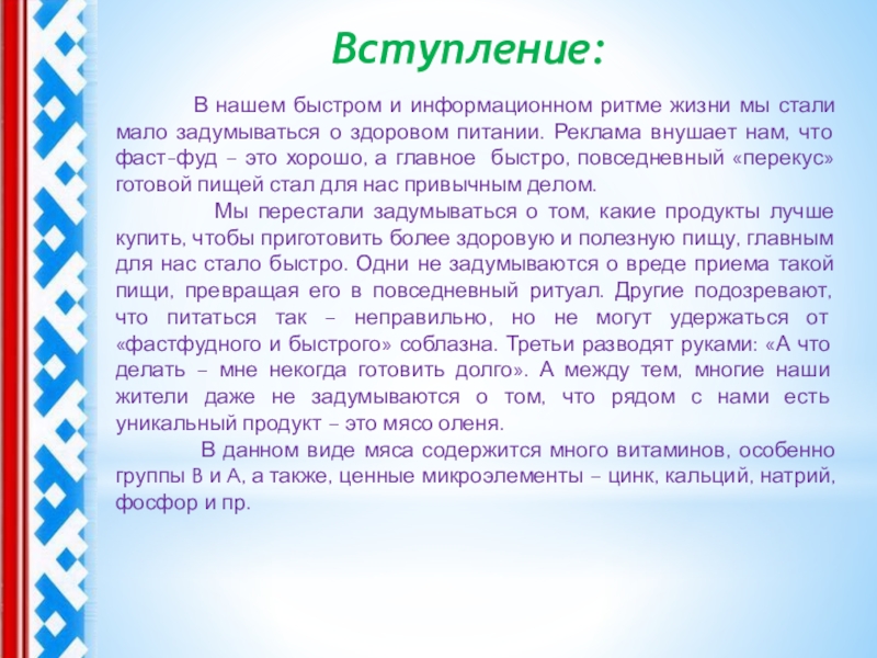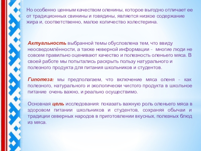 Актуальность выбранной темы обусловлена тем, что ввиду неосведомлённости, а также неверной информации - многие люди не совсем правильно оценивают качество и полезность оленьего мяса. В своей работе мы попытались раскрыть пользу натурального и полезного продукта для питания школьников и студентов.
