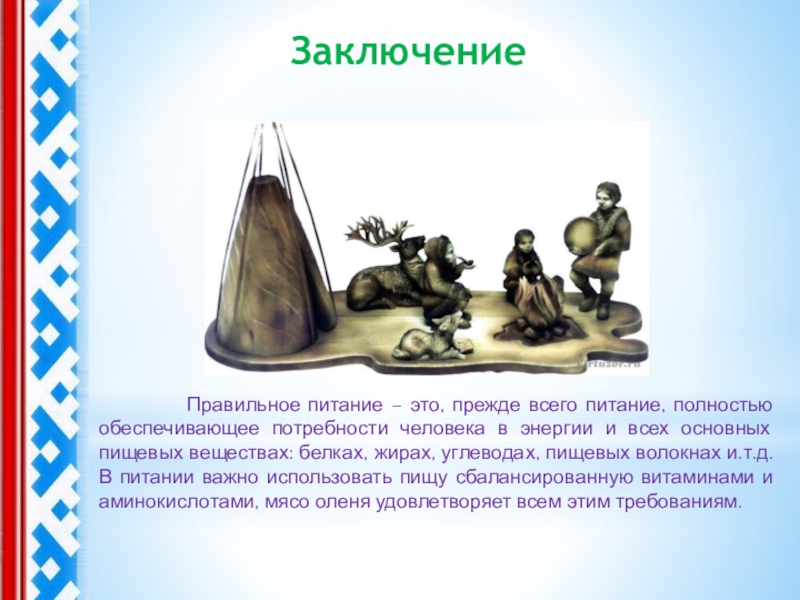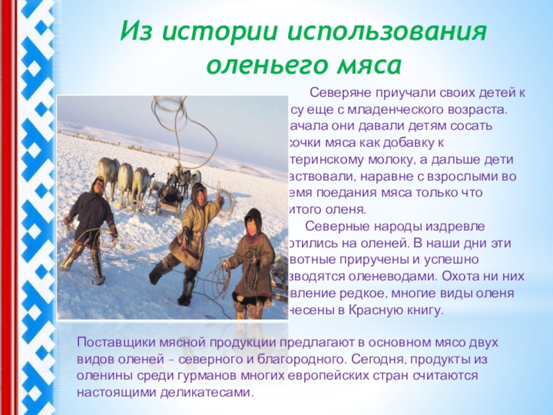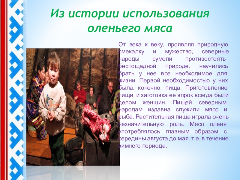 мясу еще с младенческого возраста. Сначала они давали детям сосать кусочки мяса как добавку к материнскому молоку, а дальше дети участвовали, наравне с взрослыми во время поедания мяса только что убитого оленя.