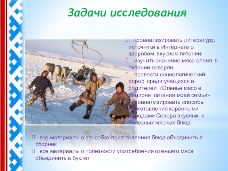 Основная цель исследования: показать важную роль оленьего мяса в здоровом питании школьников и студентов, сохраняя обычаи и традиции северных народов в приготовлении вкусных, полезных блюд из мяса.