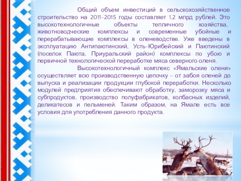 на 2011-2015 годы составляет 1,2 млрд рублей. Это высокотехнологичные объекты тепличного хозяйства, животноводческие комплексы и современные убойные и перерабатывающие комплексы в оленеводстве. Уже введены в эксплуатацию Антипаютинский, Усть-Юрибейский и Паютинский (поселок Паюта, Приуральский район) комплексы по убою и первичной технологической переработке мяса северного оленя.