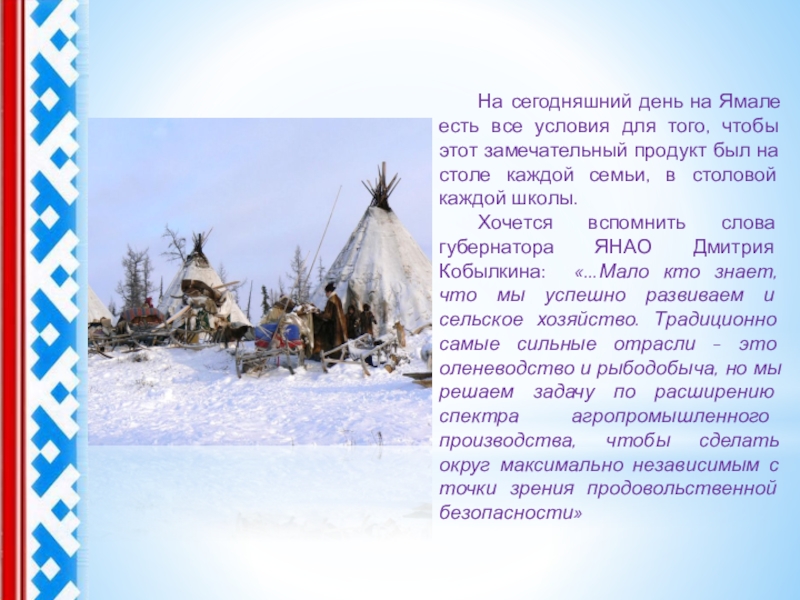 Хочется вспомнить слова губернатора ЯНАО Дмитрия Кобылкина: «...Мало кто знает, что мы успешно развиваем и сельское хозяйство. Традиционно самые сильные отрасли - это оленеводство и рыбодобыча, но мы решаем задачу по расширению спектра агропромышленного производства, чтобы сделать округ максимально независимым с точки зрения продовольственной безопасности»