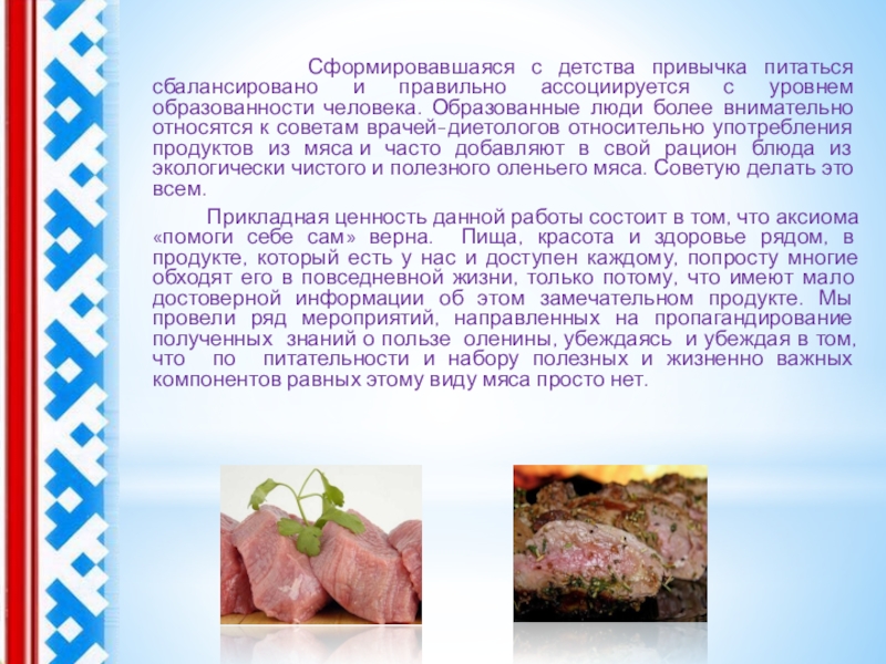 сбалансировано и правильно ассоциируется с уровнем образованности человека. Образованные люди более внимательно относятся к советам врачей-диетологов относительно употребления продуктов из мяса и часто добавляют в свой рацион блюда из экологически чистого и полезного оленьего мяса. Советую делать это всем.