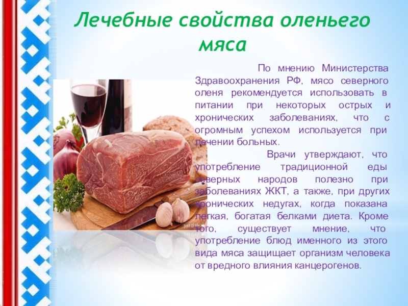 Здравоохранения РФ, мясо северного оленя рекомендуется использовать в питании при некоторых острых и хронических заболеваниях, что с огромным успехом используется при лечении больных.