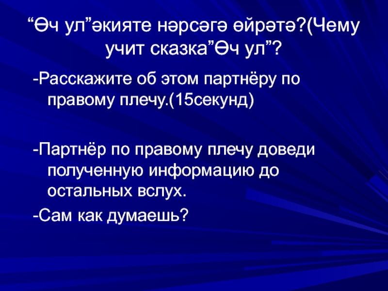 Слайд 22“Өч ул”әкияте нәрсәгә өйрәтә?(Чему учит сказка”Өч ул”?