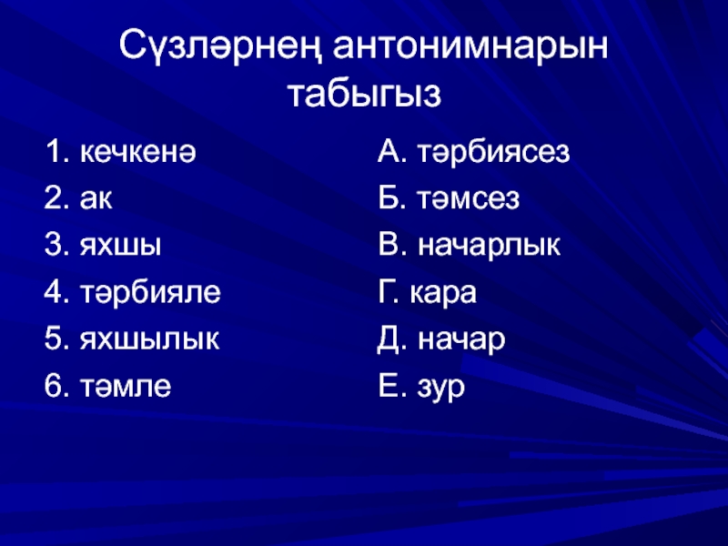 Слайд 5Сүзләрнең антонимнарын табыгыз
