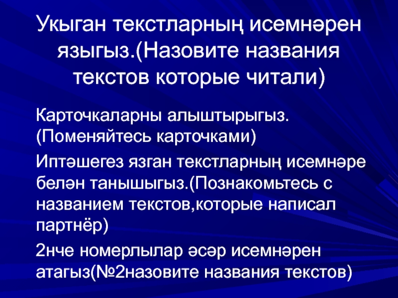 Слайд 17Укыган текстларның исемнәрен языгыз.(Назовите названия текстов которые читали)