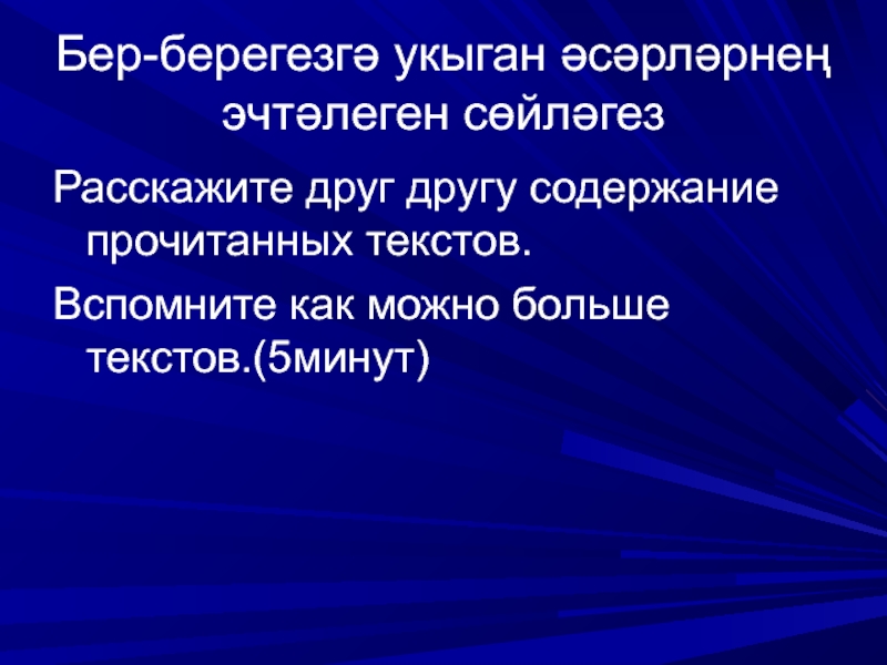 Слайд 14Бер-берегезгә укыган әсәрләрнең эчтәлеген сөйләгез