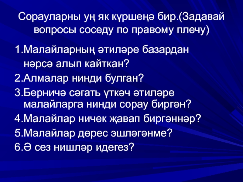 Слайд 25Сорауларны уң як күршеңә бир.(Задавай вопросы соседу по правому плечу)